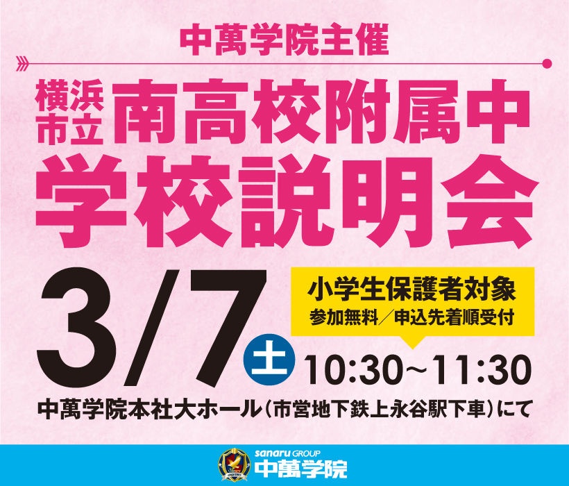 横浜市立南高校附属中の校長先生、中学校と高校の先生方をお招きして南高校附属中説明会を開催します。当日は、南高校附属中の魅力をお伝えするとともに、進学にあたってどのような準備が望ましいか、など進学をご検討されるご家庭に役立つお話もいただきます。
