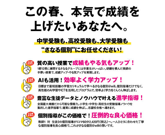 志望校合格に向けて、オリジナルカリキュラムで指導。ハイレベルな応用力・実践力を養います。教師1名×生徒2名の個別指導にAI学トレや映像授業@willを組み合わせた志望校対策を行います。