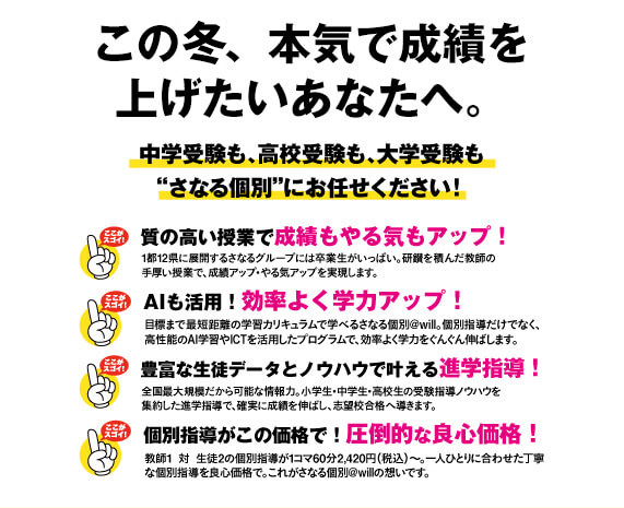 志望校合格に向けて、オリジナルカリキュラムで指導。ハイレベルな応用力・実践力を養います。教師1名×生徒2名の個別指導にAI学トレや映像授業@willを組み合わせた志望校対策を行います。