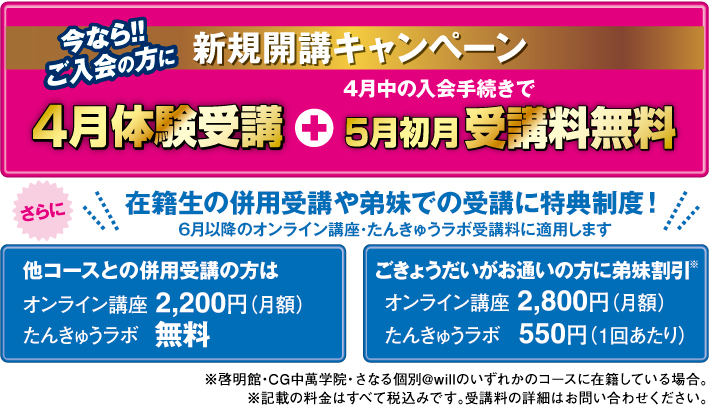 啓明館・CG中萬学院・さなる個別@will 各部門で新入学生受付中
