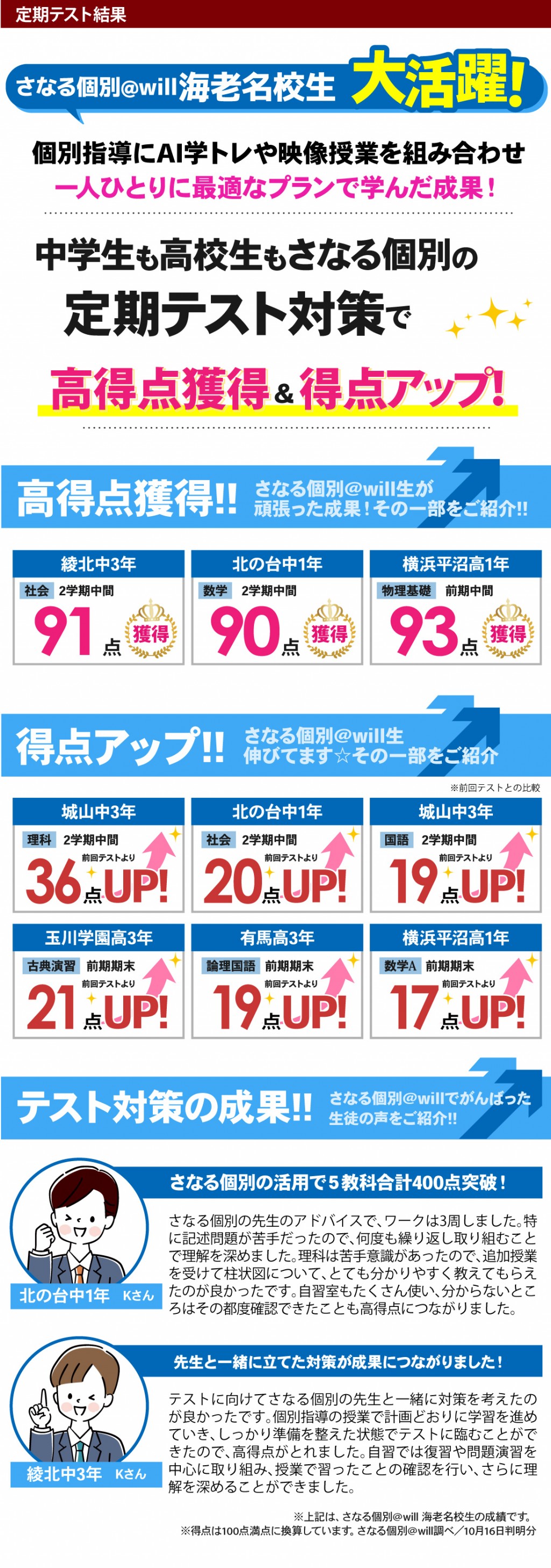 海老名市、座間市、綾瀬市の各中学校の定期テスト対策・単元テスト対策はお任せください!成績を上げるためのコツを伝授します。近年定期テストを減らす学校が増えています。定期テストがない場合は日頃の学習習慣が特に重要です。無料学習相談にて詳細をお伝えいたします。